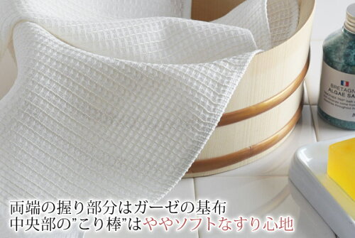 背中のあかすりに使い易いよう細長く 背中にあたる部分に織り・材質の工夫